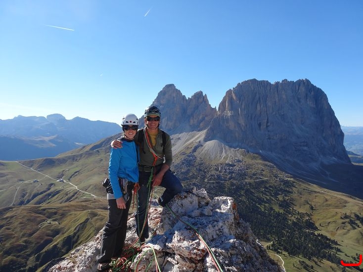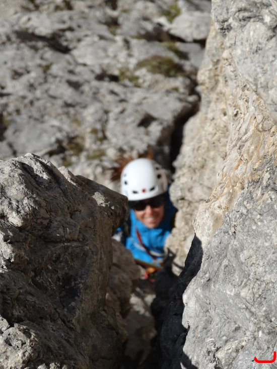 Les 3 premiers jours, escalade dans les tours de Sella, histoire de voir de quoi il en retourne. Pour commencer, une mise en jambe dans la Torre del Sella I, via "dei camini" et poursuivre sur la Torre II, Fessura di destra (parete sud). Deuxième jour, à la Torre I, la via "Trenker"... un peu déçu. Mais le troisième jour, une voie excellente que je vous recommande, la via "Schubert" au Piz Ciavazes.