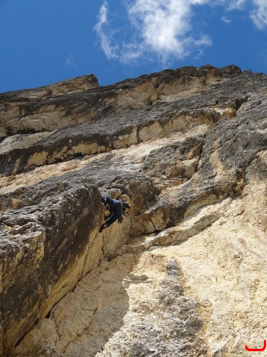 Quatrième jour, on quitte Canazei direction Cortina. On profite de la route pour faire un tour à la Torre Grande di Falzarego, Via "Dibona". Escalade assez facile, enfin jusqu'à ce que je me perde et qu'on se retrouve dans une voie une moderne. Sortie à l'arrache, mais quel souvenir.
