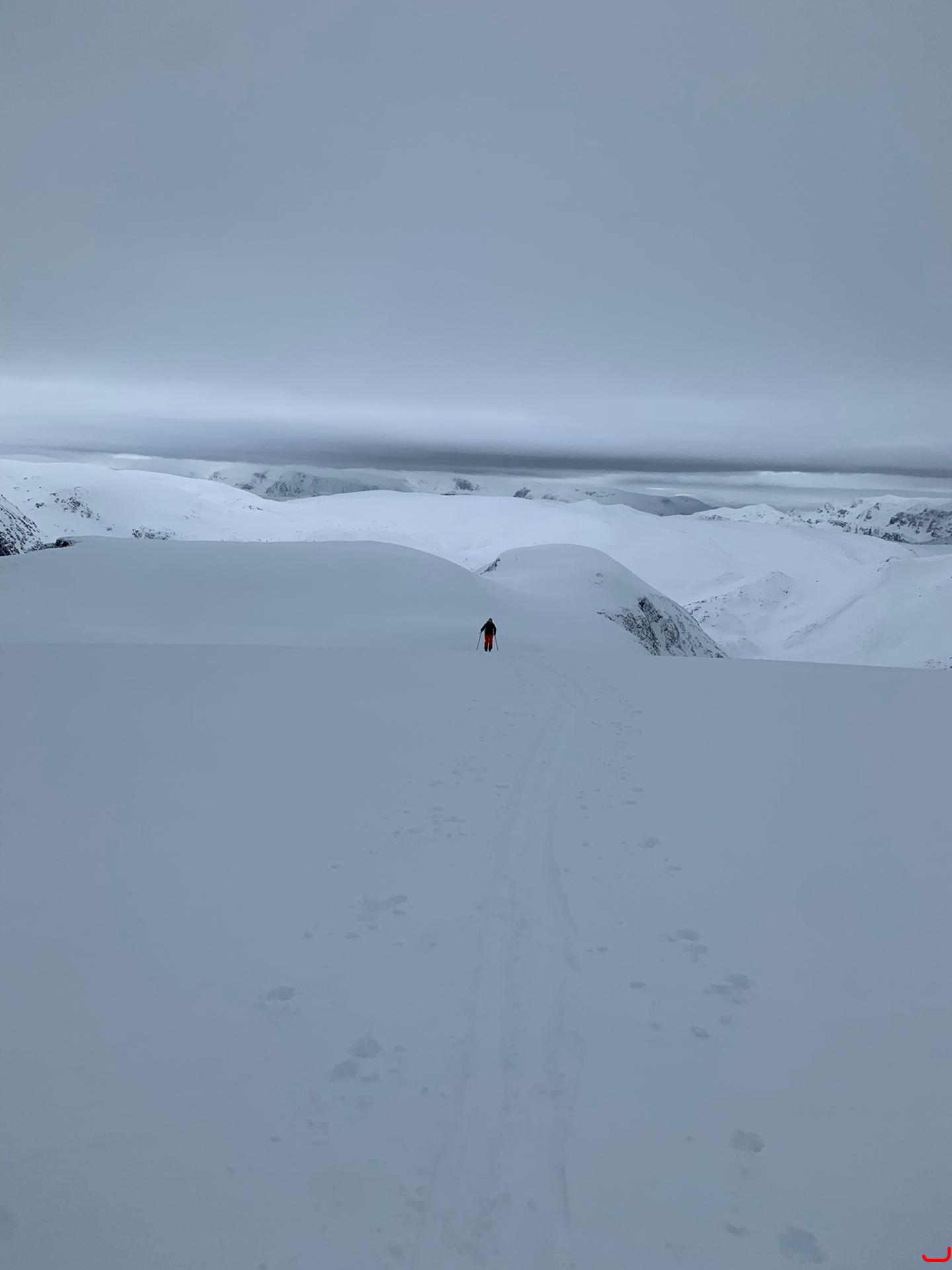 Mon choix se porte sur un itinéraire qui me emblait très sûre, les 100 derniers mètres mettront en doute cette confiance aveugle de les cartes norvégiennes. La neige est humidifiée en profondeur et c'est plus raide que sur la carte. Les petites avalanches récentes sont la pour le prouver.