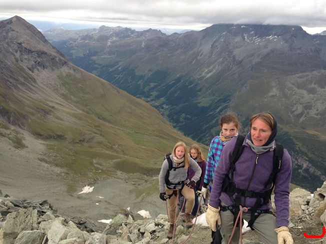 Deuxième jour, montée au Pigne de la Lé par l'arrête N-W (escalade facile) et descente par le glacier. Retour à la cabane pour le picknick et descente jusqu’au lac.