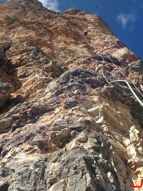 Quatrième jour, on quitte Canazei direction Cortina. On profite de la route pour faire un tour à la Torre Grande di Falzarego, Via "Dibona". Escalade assez facile, enfin jusqu'à ce que je me perde et qu'on se retrouve dans une voie une moderne. Sortie à l'arrache, mais quel souvenir.