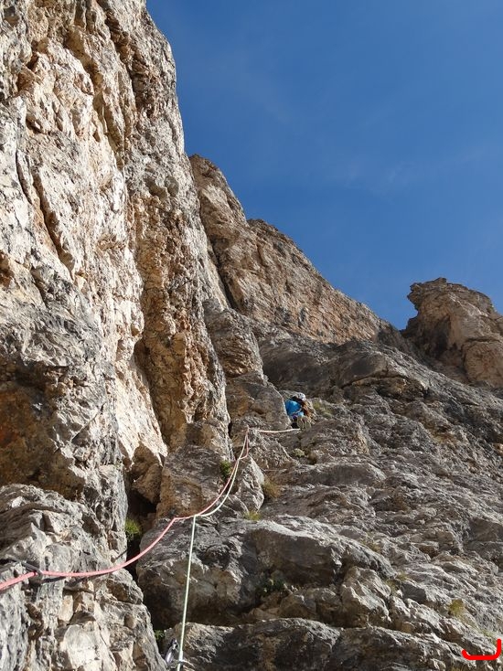 Les 3 premiers jours, escalade dans les tours de Sella, histoire de voir de quoi il en retourne. Pour commencer, une mise en jambe dans la Torre del Sella I, via "dei camini" et poursuivre sur la Torre II, Fessura di destra (parete sud). Deuxième jour, à la Torre I, la via "Trenker"... un peu déçu. Mais le troisième jour, une voie excellente que je vous recommande, la via "Schubert" au Piz Ciavazes.