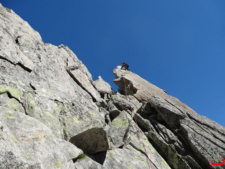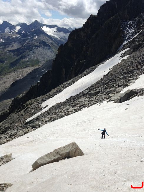 Quatrième jour, on s’attaque à du un peu plus sérieux : Gross Furkhorn. Du granit comme à Chamonix, une ambiance gazeuse, une vraie escalade en grosse avec 1-2 passages de V, bref une course de rêve. J’en profite pour coincer définitivement mon coinceur n° 10. On dira que c’était fait exprès, pour aider les prochaines cordées ;-).